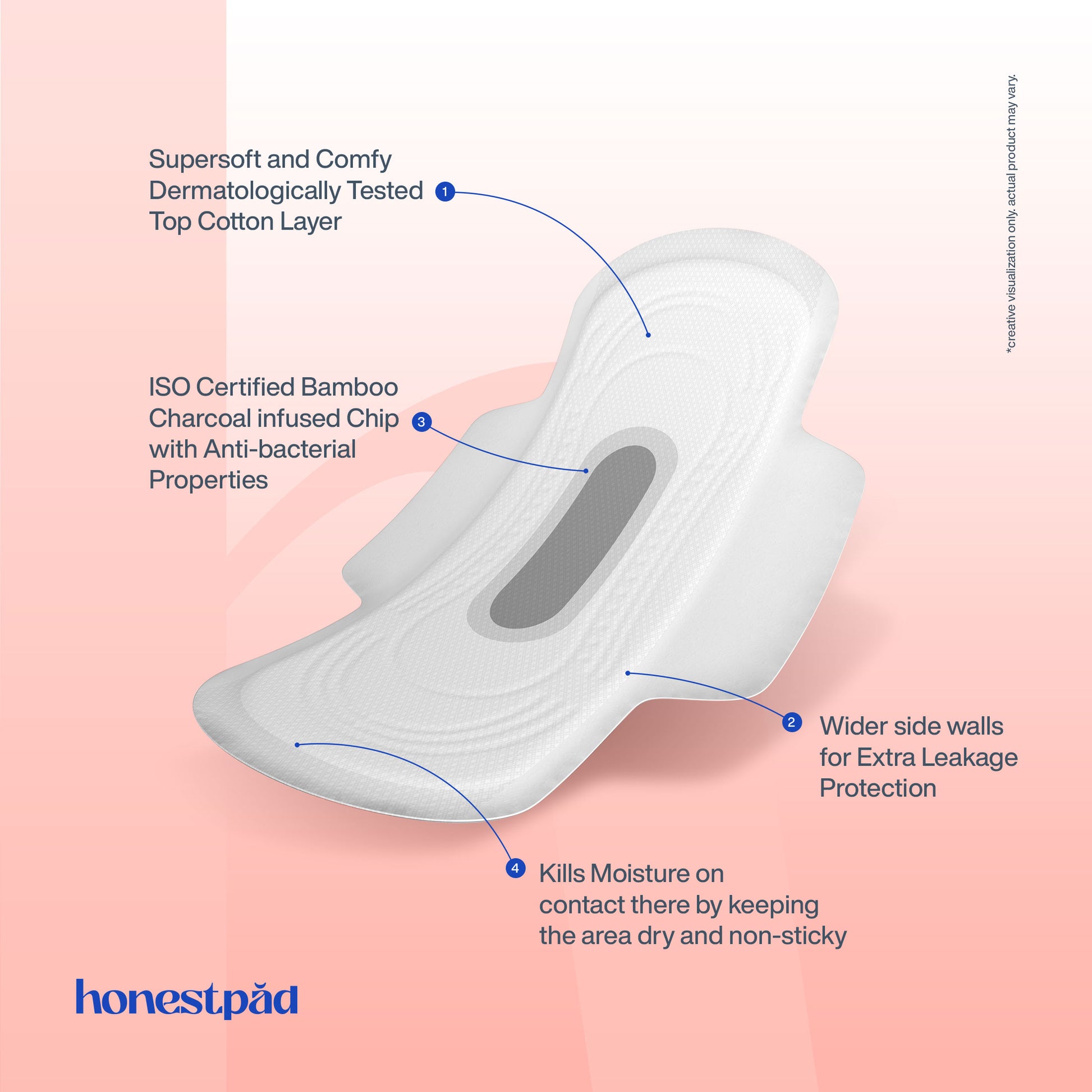 Honestpad is designed for your comfort and safety- made with premium organic cotton, Bamboo Charcoal Chip that are gentle on the skin and provide long-lasting protection against leaks and odours. Say goodbye to rashes, allergies, and infections and say hello to safe and convenient period care.