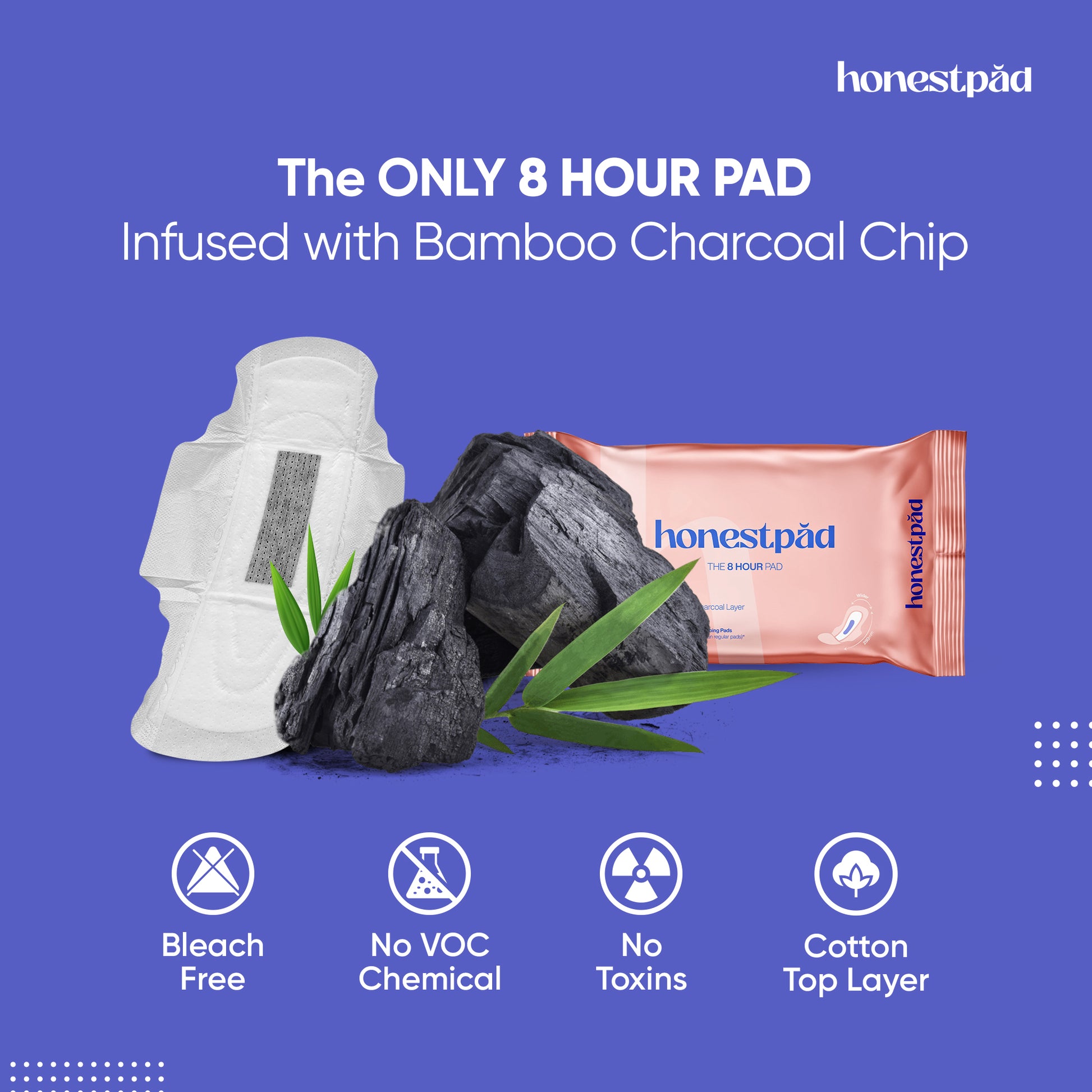 Honestpad is designed for your comfort and safety- made with premium organic cotton, Bamboo Charcoal Chip that are gentle on the skin and provide long-lasting protection against leaks and odours. Say goodbye to rashes, allergies, and infections and say hello to safe and convenient period care.
